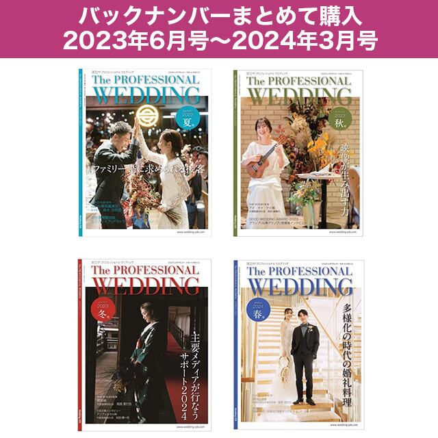 「The Professional Wedding」のバックナンバーを複数号まとめて購入したいと思っている方々に、お得なパッケージを用意いたしました。読みたいと思っていたインタビューや、特集記事の載った号以外にも、これを機にまとめて購入することで、今後の接客や取るべき戦略のヒントがより多く得られるでしょう。